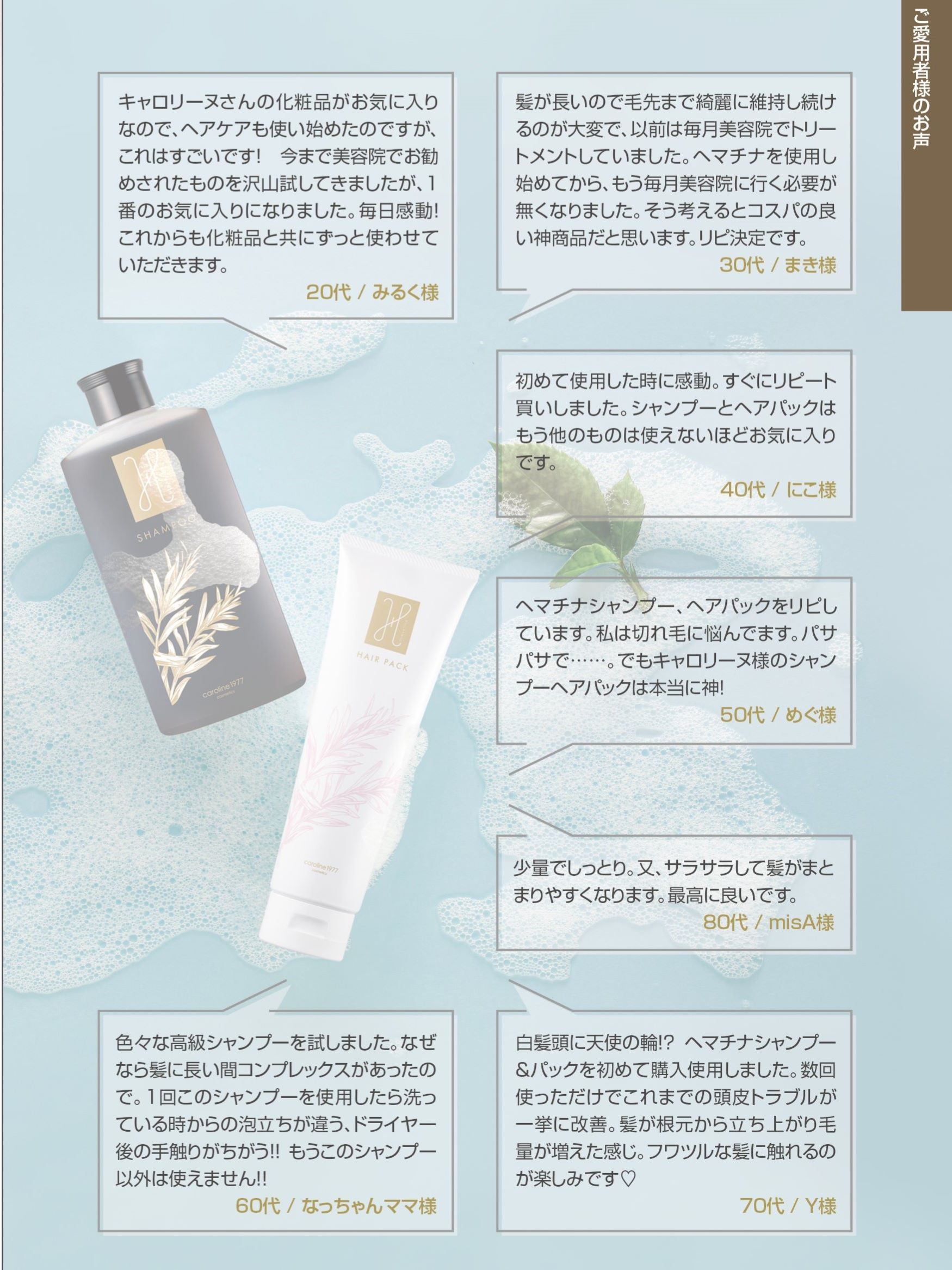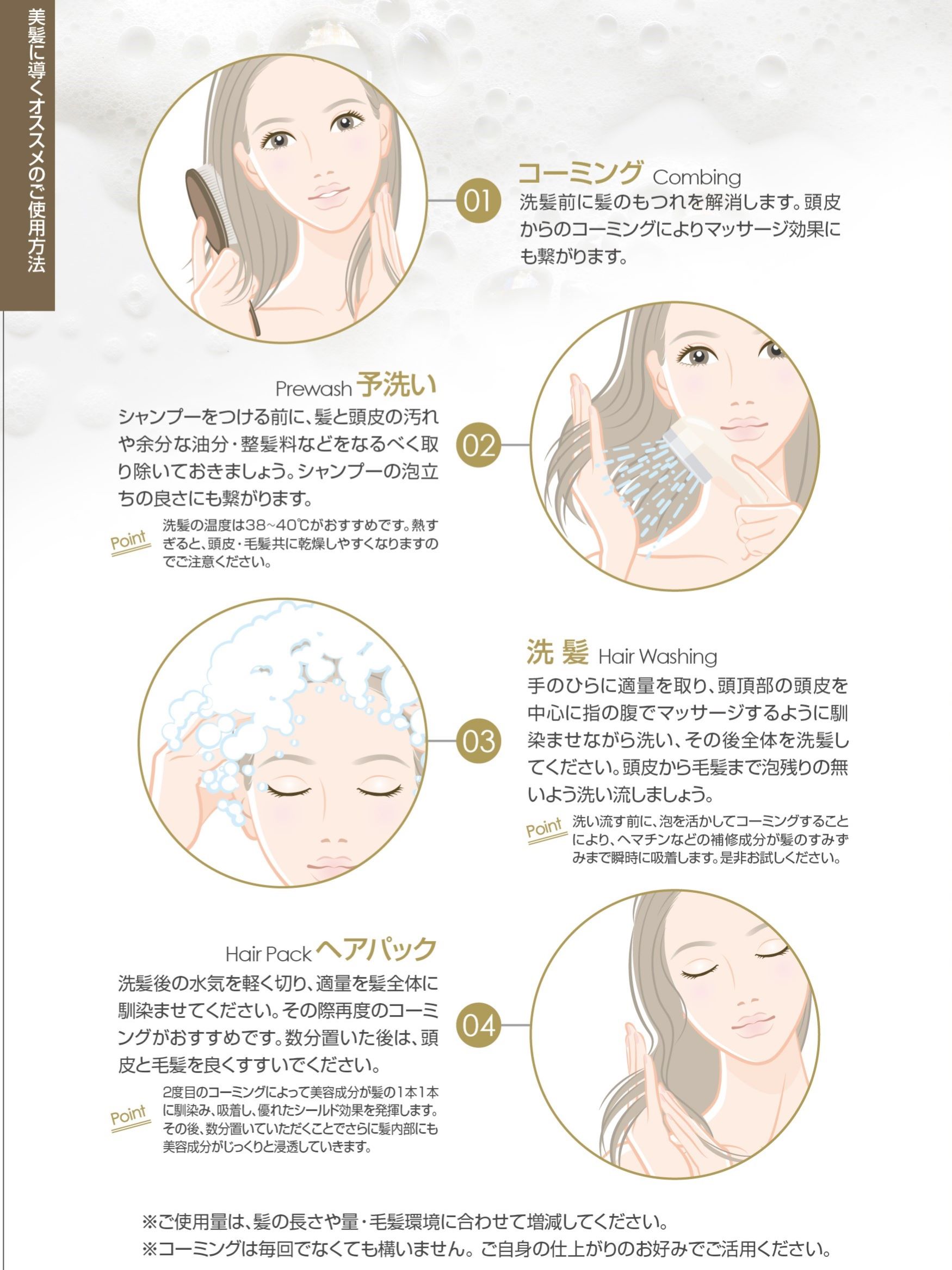 ・髪の補修ケアと年齢に応じたお手入れの頭皮にハリ・ツヤ・潤いを与えるエイジングケアとしてもお使いいただけます。