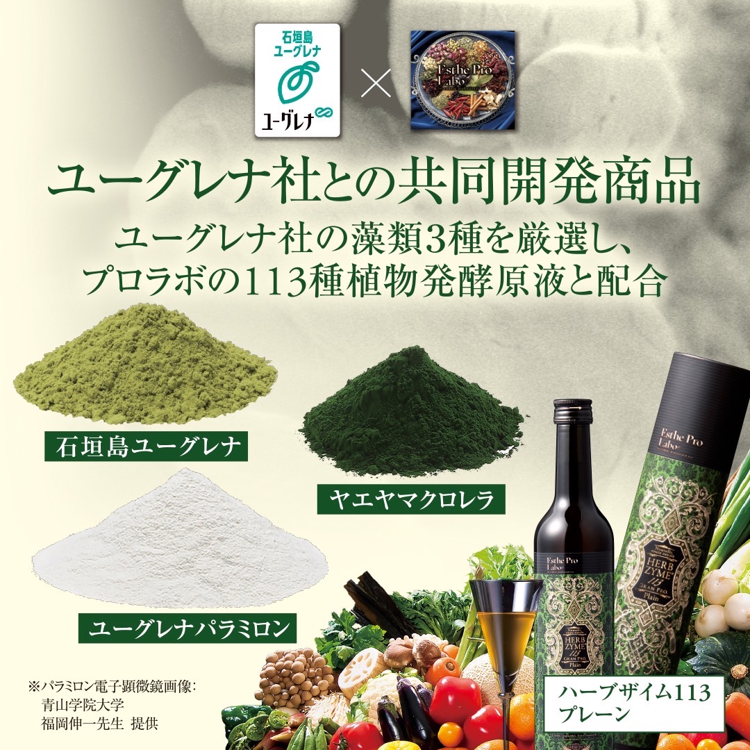 原料には、“睡眠” “ストレス” “疲労感”と3つの機能を特徴にもつ次世代のユーグレナ「ユーグレナ由来パラミロン」をはじめ59種類の自然由来栄養成分をもつ「石垣ユーグレナ」、 さらに天然デトック素材として愛用される「ヤエヤマクロレラ」と3種類の藻を配合し、植物発酵による82種の乳酸菌含有の「ハーブザイムプレーンパウダー」を配合。