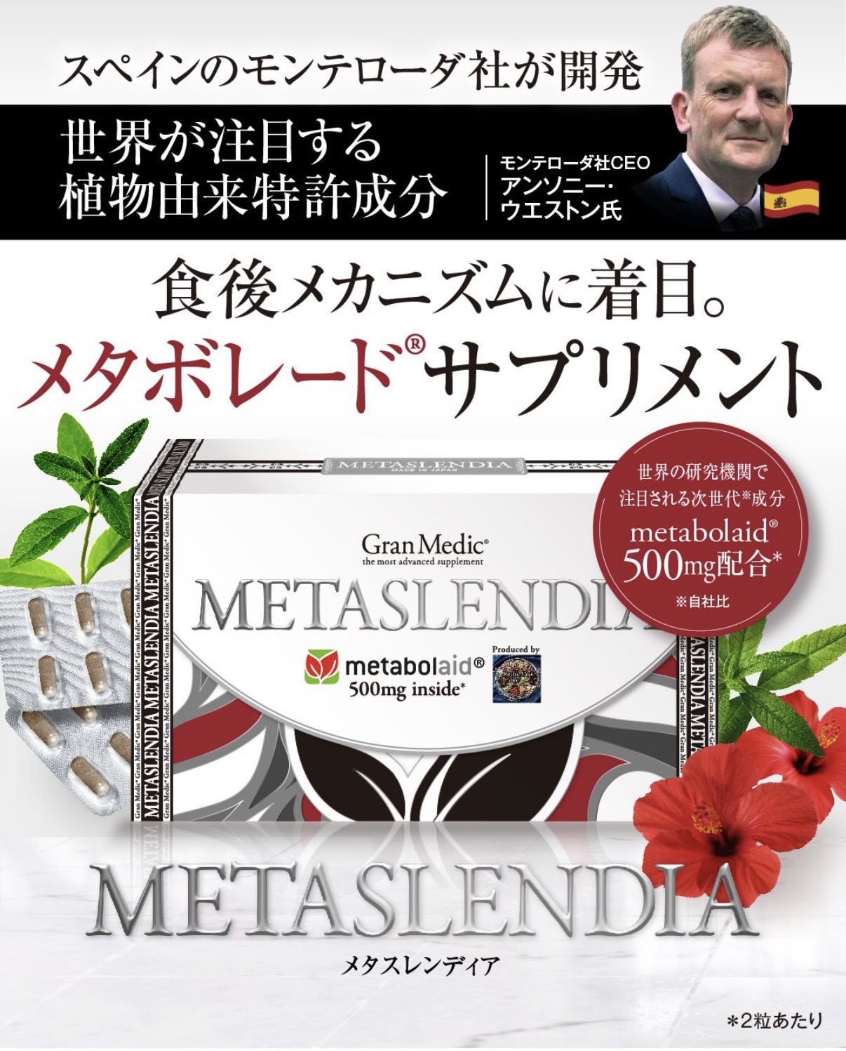 『METASLENDIA』はスペインのモンテローダ社が開発した特許取得成分である「metabolaid®」2粒で500㎎配合。