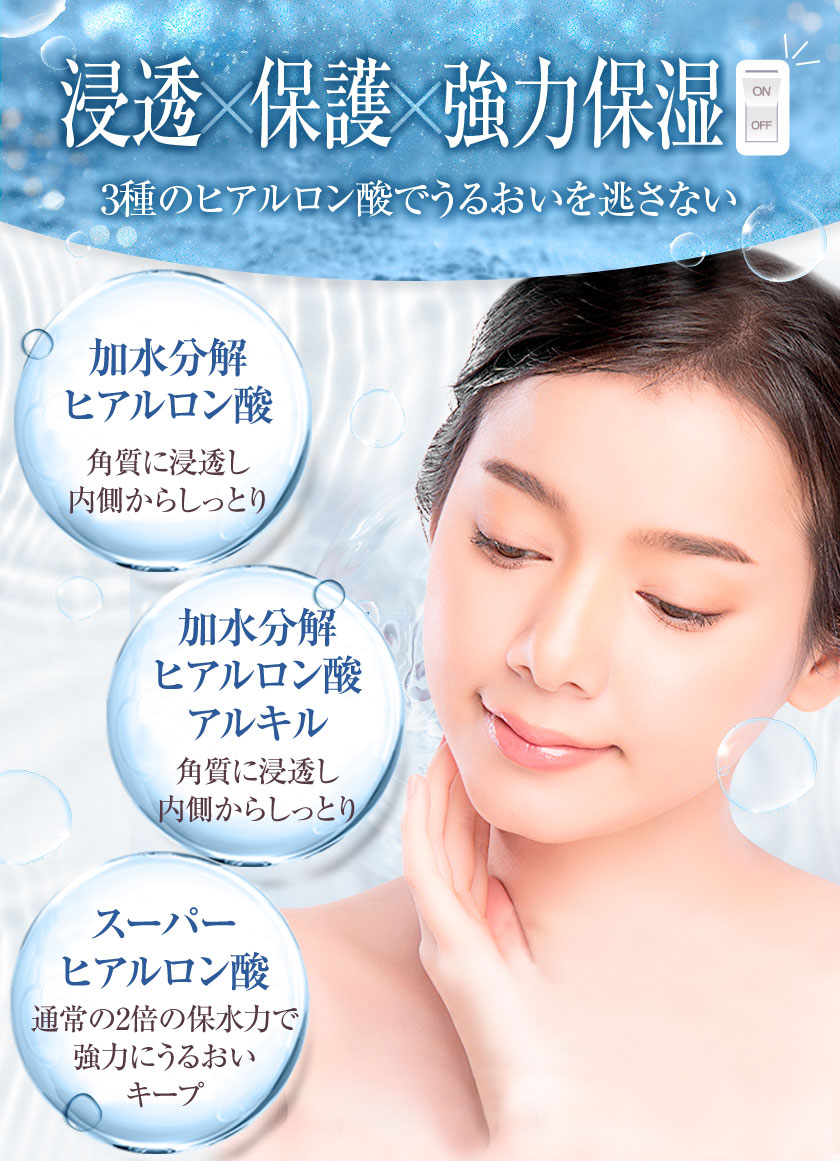 浸透✕保護✕強力保湿の3種のヒアルロン酸でうるおいを逃がしません